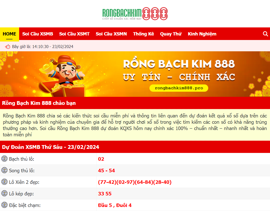 Rồng Bạch Kim 888 (rongbachkim888) hiện là hệ thống soi cầu xổ số 3 miền phổ biến và được nhiều người tin tưởng nhất. Đến nay, mỗi ngày có hàng triệu người truy cập để tìm kiếm và tham khảo các con số chuẩn xác và may mắn. Rồng Bạch Kim 888 hoàn toàn miễn phí, có độ chính xác cao và cung cấp các cặp số đẹp nhất với khả năng cao về trong ngày.