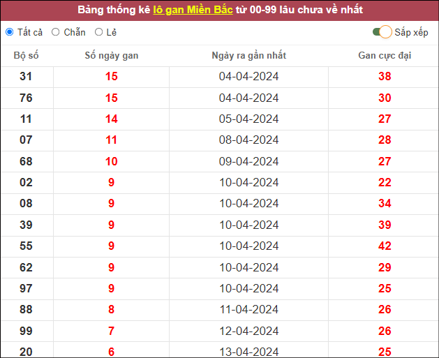 Thống kê lô tô miền Bắc hôm nay 20/4/2024