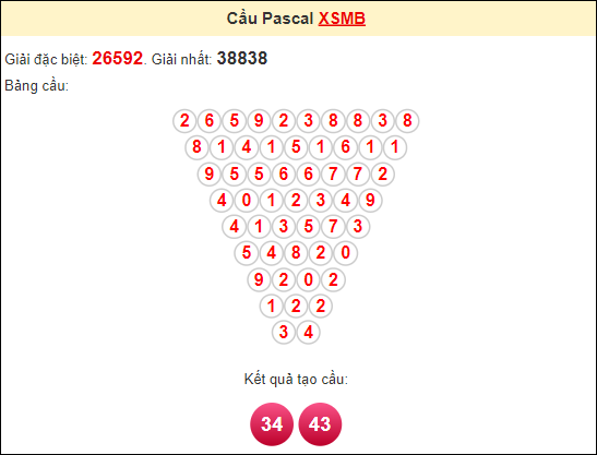 Kết quả từ soi cầu Pascale là cặp số may mắn: 34 43