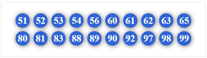 20, 21, 23, 24, 25, 26, 27, 28, 29, 50, 51, 52, 53, 54, 56, 57, 58, 59, 80, 81, 82, 83, 84, 85, 86, 87, 89, 90, 91, 92, 93, 94, 95, 96, 97, 98