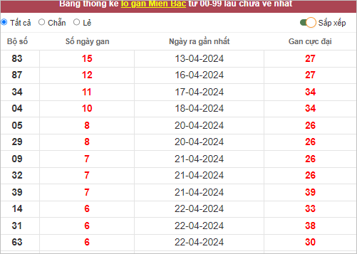 ⭐️Lô gan MB lâu ra nhất: 83 – 87 – 34 – 04 – 05